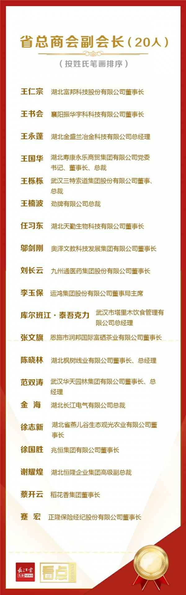 5月27日,湖北省工商业联合会(总商会)第十三届执行委员会第一次全体会议在武汉市洪山宾馆召开。会上,40名民营企业家当选第十三届湖北省工商联(总商会)兼职副主席(副会长),祝贺他们!